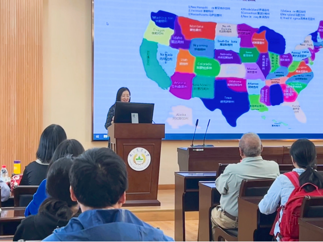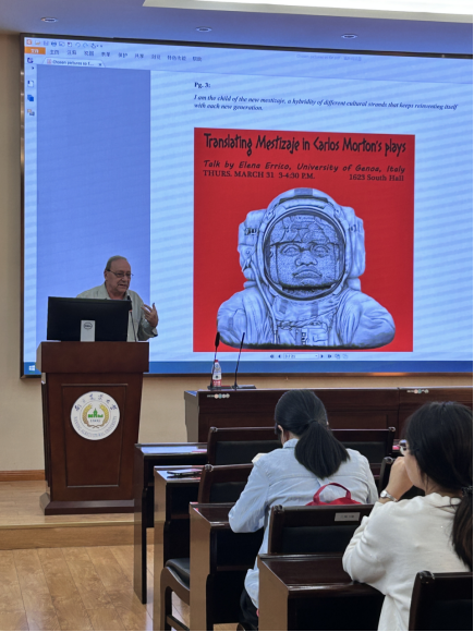 莫顿是美国著名戏剧家,精通西班牙语、拉丁语、意大利语等多种语言。他以英语和西班牙语进行双语创作,出版有一百多部戏剧作品,多次搬上百老汇等戏剧影视舞台,并应邀在欧美亚洲多国进行学术交流活动。在讲座中,莫顿历数了美国版图的扩张背后的历史与文化发展,从自己的族裔身份出发,介绍了墨西哥裔美国人的历史渊源与民族认同。对于以西班牙语作为第一语言,英语作为第二语言的墨裔族群来说,跨越边界是一场持续终生地认识与建构自我的行程。莫顿列举了自己在欧洲的访学与旅行经历,指出作家的写作对呼吁正义、倡导共存的世界主题有极大的推动作用。