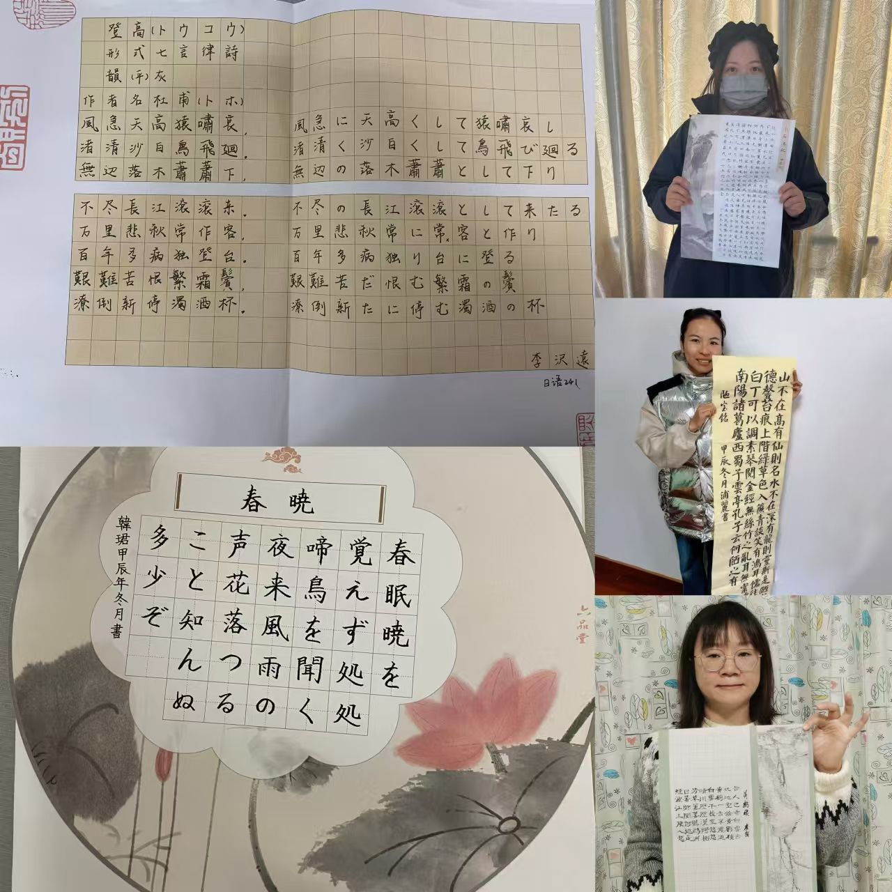 浦丽的《陋室铭》采用中豪颜体,笔画遒劲有力,仿佛山峦起伏,气势磅礴,尽显颜体之韵;戈嫣嫣的《小石潭记》采用小豪撰写,笔法秀丽隽永,墨韵非凡。王薇的隶书《黄鹤楼》古朴大气,流畅自然。此外,学生们也积极参与其中。如大一学生韩珺的日文版《春暁》端庄秀逸,笔力独绝;李泽远的日文版《登高》一笔落下,万千气象。书法之美,尽在不言中。