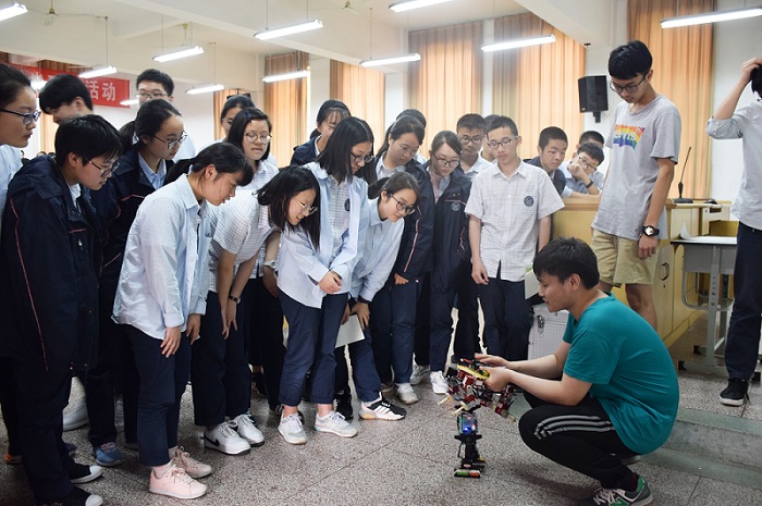 讲座现场,我校徐文昌、李家诚两位同学还向同学们展示了旅游机器人、双轮平衡车等4件科技作品,并就作品设计理念、创作过程、应用前景等话题与同学们展开分享交流。同时,天一中学的同学们还详细询问了我校的专业设置、就业方向和往年录取分数等热点问题。