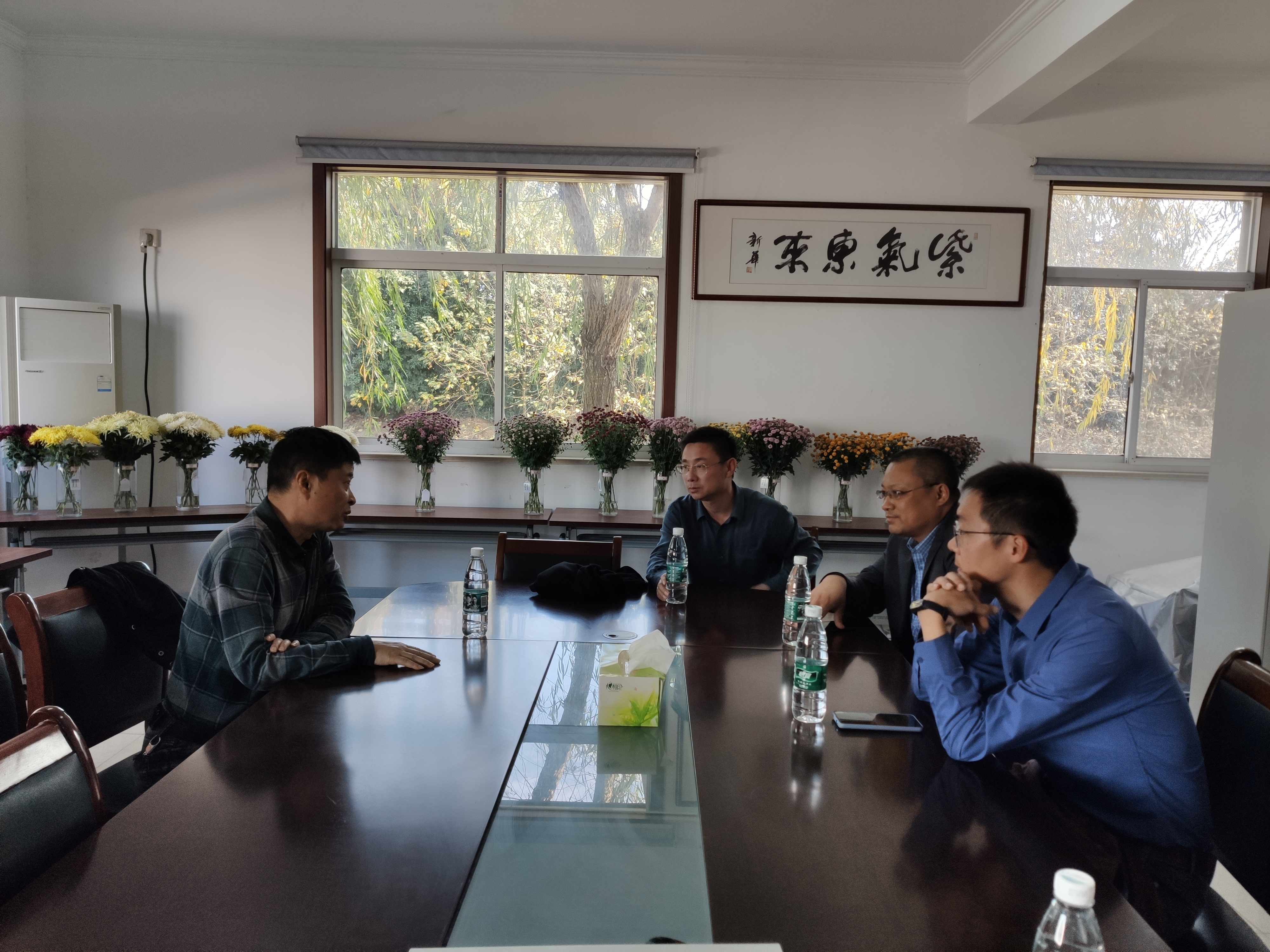 参观结束后,我校与邓洪贤一行进行了座谈交流。交流会上,张智介绍了我校湖熟菊花基地的情况,邓洪贤介绍了天一中学生态课程的建设情况,双方在中学生态课程推进和菊花育种培育方面展开了交流。
