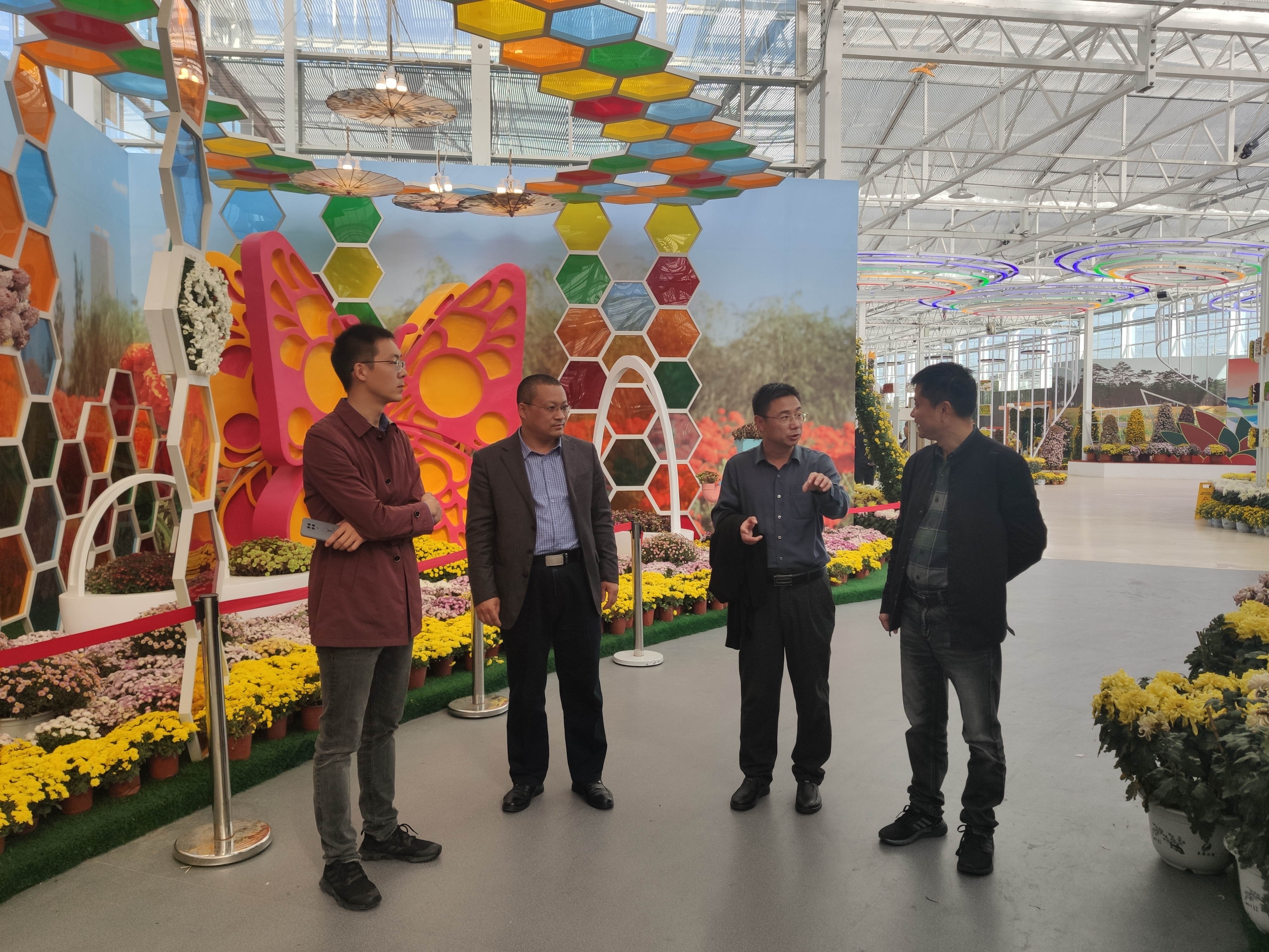 在园艺院张智老师的带领下,邓洪贤一行参观了我校菊花基地的室内展馆、温室育种室等场馆,并在菊花嫁接、育种、插花艺术展举办等方面给予了专业指导并提出了相应的建议。