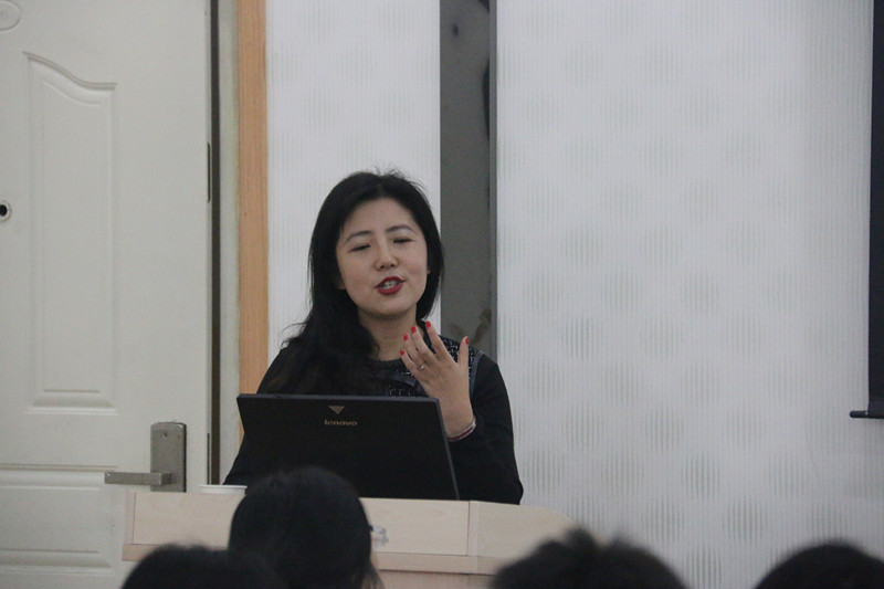 接着,许诗焱结合自己的学术及翻译实践经历,向在座的师生详细讲解了翻译过程中译者需要关注的特点,如文字翻译,语境构建及译者如何传递文体风格等。她表示,译者要根据原作的所处时期来处理译文。同时,她还强调学生要学会整合资料,善于发现新问题,找到新思路,并希望大家能为推动中国文化走出去而努力!