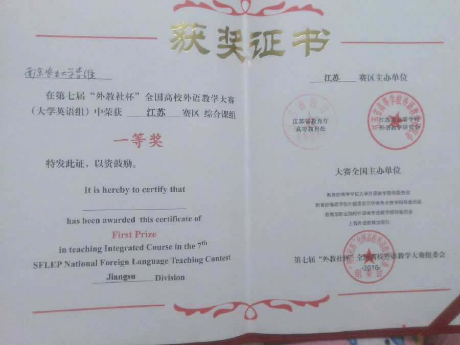 5月29日,由江苏省教育厅高等教育处、江苏省高等学校外语教学研究会和上海外语教育出版社联合举办的第七届“外教社”杯全国高校外语教学大赛在扬州大学落幕。我校黄色动漫 的李维老师通过初赛、复赛最后进入决赛。在决赛中与其他十一位来自全省其它高校的优秀教师同场竞技。比赛包括现场授课、即兴说课以及现场提问等环节,李维老师在比赛中展现了强劲的实力,最后荣获综合组一等奖,充分展示了我校老师较高的外语教学水平。