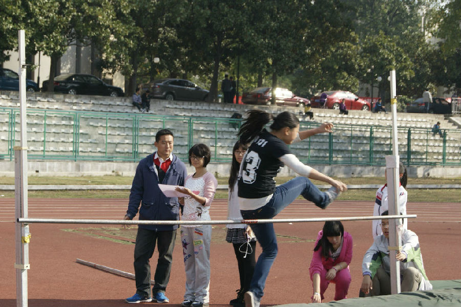 10月27日上午9点,为迎合外语院2013级运动会,女子跳高决赛在操场北面的场地上进行。经过初赛的淘汰,留在场上的选手可谓都是精英。