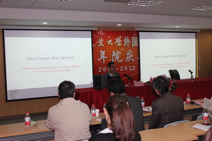 师生及参加院庆庆典的嘉宾做了一场主题为“我们报道世界:迅速变革的时代里美国媒体新闻的读与写”的学术报告。