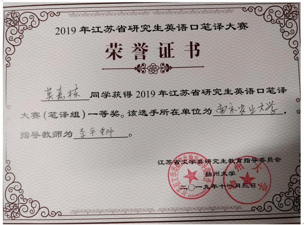 通过选拔,派出莫嘉栋、陈丹仪参加笔译赛事,邓玉萍、刘国豪参加口译赛事。赛前,李平老师、霍雨佳老师分别对四位同学进行了笔译和口译培训。通过现场角逐,四位同学不负众望,分别获得笔译一等奖、二等奖,口译三等奖、优胜奖,为我校争得了荣誉。尤其是莫嘉栋同学,在笔译赛事中以总成绩第一名获得一等奖(总成绩=汉译英成绩*50% +英译汉成绩*50%)。
