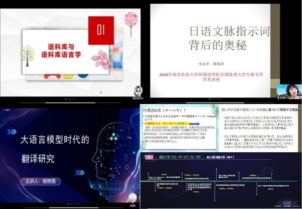 在学术讲座环节,副院长马秀鹏教授介绍了生态文学批评的两次浪潮,追溯其发展根源和历程;英语系主任李平教授介绍了林语堂真善美的翻译思想,指出要在实践中运用优秀翻译思想,并加以发展创新;日语语言文学硕士点点长李红教授分享了自己的日语学研之梦,评述了日语学科专业发展与科研路径;英语系贾雯副教授用基于自己的故事讲述了“科研,就在身边——应用语言学在教学中的实证研究”,英语系杨艳霞副教授从发展历程、技术逻辑等层面对大语言模型时代的翻译研究进行综述;日语系周萌副教授阐释了语言研究的两大范式,回顾了日语语言的语料库研究,日语系陈海涛博士围绕考试和科研两个层面讲解了日语指示词中的奥秘。