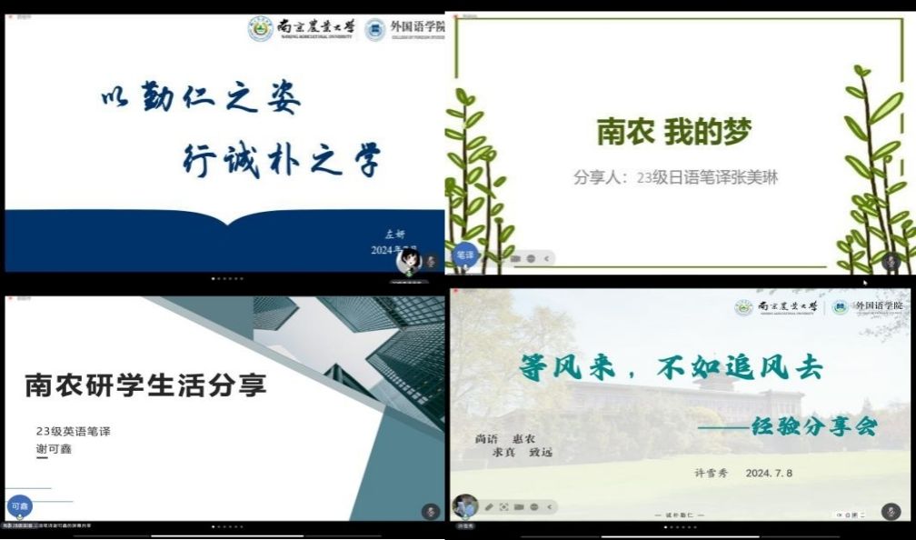 7月9日上午,英语与日语方向分为四组进行了线上考核。下午举行了夏令营闭营仪式。主持人樊淑英副教授公布优秀营员名单。营员们用双语交流个人收获,感谢学校提供的宝贵机会,表示继续践行“博学不穷,笃行不倦”的精神。副院长李震红在总结致辞中向所有营员表示祝贺。她肯定了营员们的出色表现,寄语大家发挥语言特长,为向世界讲好中国故事做出贡献。她向各位营员发出邀请,欢迎选择美丽的南农深造,并宣布夏令营圆满结束。
