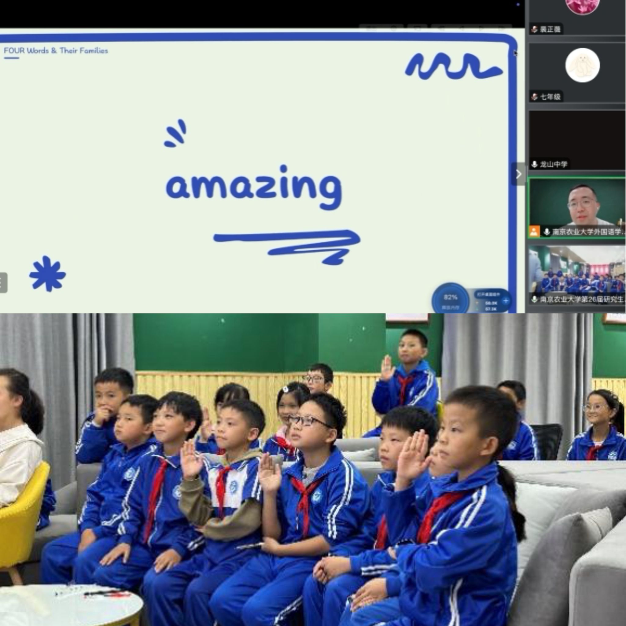 组织了面向麻江县第三小学和龙山中学的线上英语教学活动。本次活动涵盖六个年级,共有116名学生参与。黄色动漫
