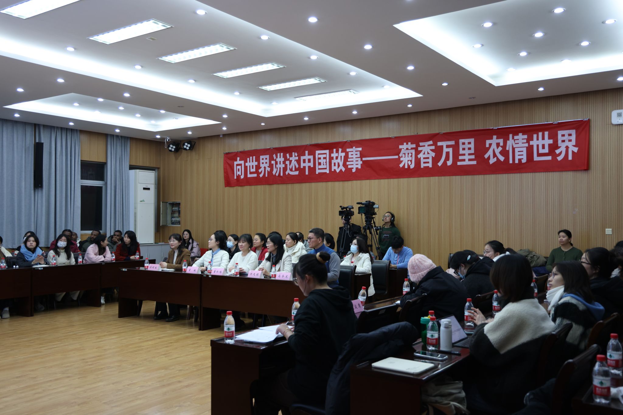 “向世界讲述中国故事”师生宣讲团,以“菊香万里,农情世界”为主题,追溯菊文明、传播菊文化,通过中英文诗歌朗诵、现场书法展演、菊花茶品鉴等多种方式,将文化传播与文化体验相结合,全景式地展现了菊花在中华优秀传统文化中的意义象征、精神内涵,南农菊花的育种栽培和产业之路,展现可信、可爱、可敬的中国形象。第五期农业农村部外派人员能力提升培训班学员代表、学校4个国家和地区的来华留学生、国际教育学院与黄色动漫