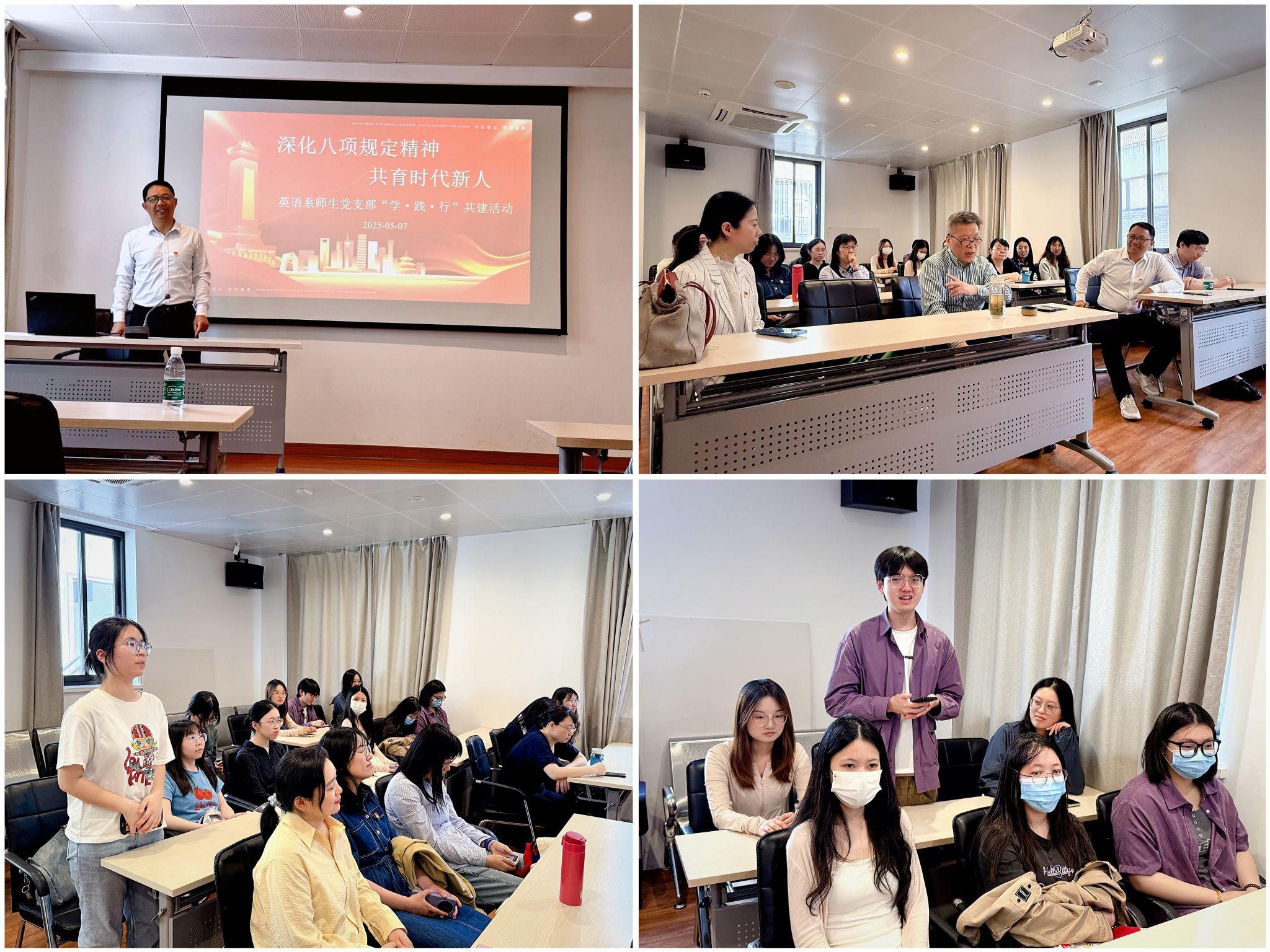 参观结束后,一场别开生面的专题研讨拉开帷幕。学生党员代表吕越、俞丹蓉结合参观感悟,分享新时代青年对廉洁文化的理解;英语系系主任李平教授立足南京城市历史与时代需求,号召师生以周恩来同志的奋斗作风为标杆,既要深耕专业知识,更要扎根基层开展外语服务实践;英语系老师陈丽颖围绕党史学习与课程思政融合,分享将红色精神融入外语课堂的创新路径;英语系教授王银泉则从专业视角对梅园新村英文介绍进行点评,鼓励师生以语言为桥梁,传播红色文化。