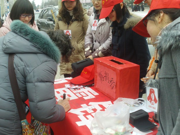 本次活动为期两天,志愿者们共计24人,分为两大组,第一组已于昨天在新街口募捐完毕,第二组志愿者们今天下午在卫岗苏果社区店展开行动。此次活动采取“一个阵地募捐,多个阵地宣传”的形式。下午1点钟左右,志愿者们已经就位,在超市门口设立了募捐点,在各大人群密集处分发传单,并向路人宣传介绍关于募捐活动的相关内容,耐心地解答路人的疑惑。不少路人解囊相助,并在横幅上签字以示支持。捐助者既有年过七旬的老人,也有在父母陪同下咿呀学语的孩童;捐助金额从一元的硬币到几百元不等。志愿者们都一一鞠躬致谢,“爱心不分多少”,每一位捐助者都会得到一张志愿者们亲手制作的纪念书签。由于募捐在室外进行,气候条件十分恶劣,然而路人的爱心温暖了每一位志愿者。