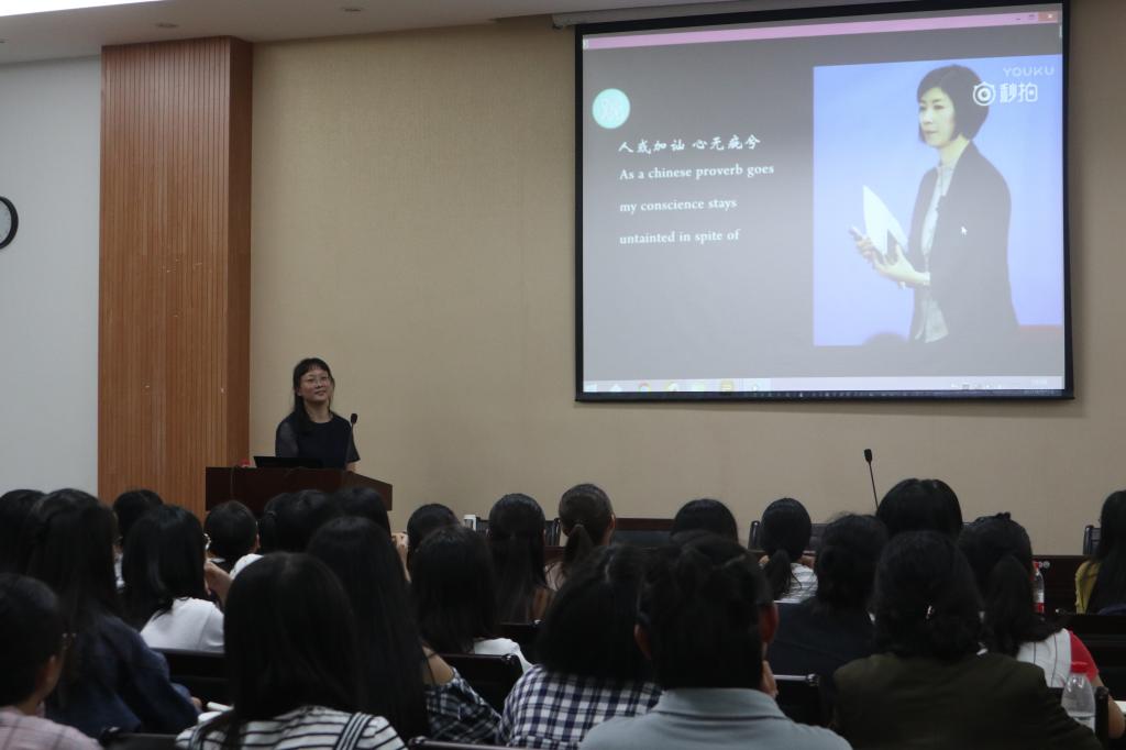 顾明生又分析了在大数据时代,英语专业学生能够做些什么、存在的意义又是什么。并鼓励新生们为之努力、为之奋斗。在会议的最后,顾明生给新生们看了著名翻译家张璐的口译视频,视频中张璐优秀、知性的形象引来台下雷动的掌声。张璐近乎完美的翻译激励了在场的每一位新生。