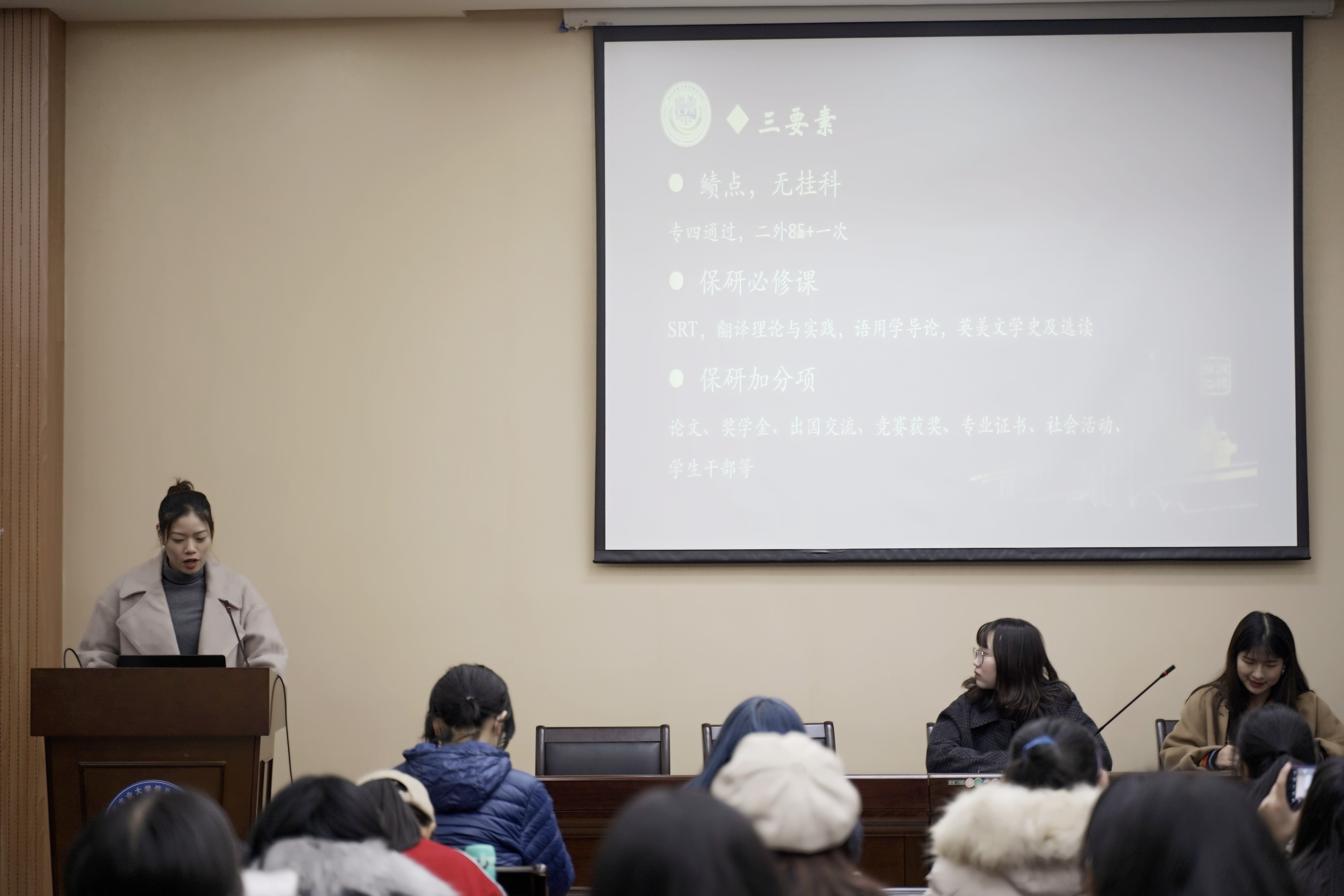 吉雪萌和裴杨阐述了学习成绩和必修课在推免中的基础性。吉雪萌在明确目标、分割任务、脚踏实地和细心耐心四个方面提出建议。裴杨详细地讲解了英语专业的深造方向和学习要点,从出国交流的角度介绍了出国交流学习的利弊及交流机会,从学生工作、社会实践和院校投递的角度,详细地介绍了前期准备材料和考前准备。